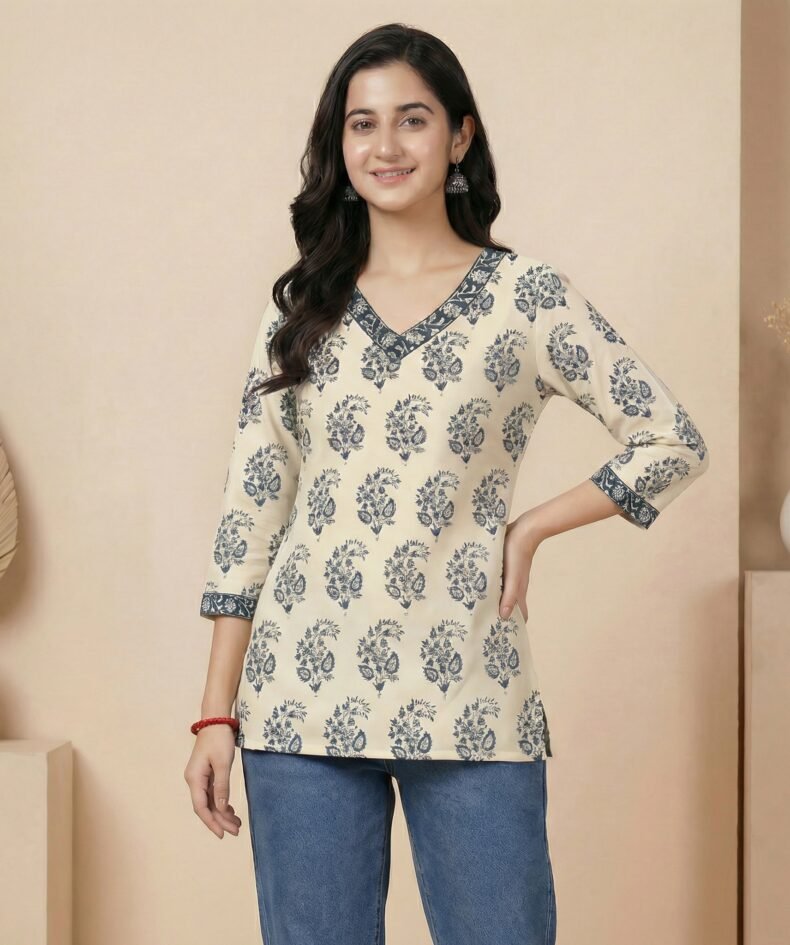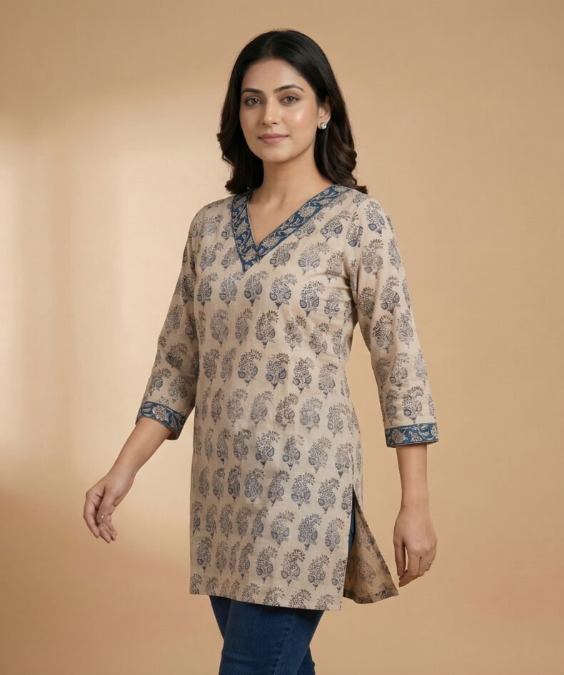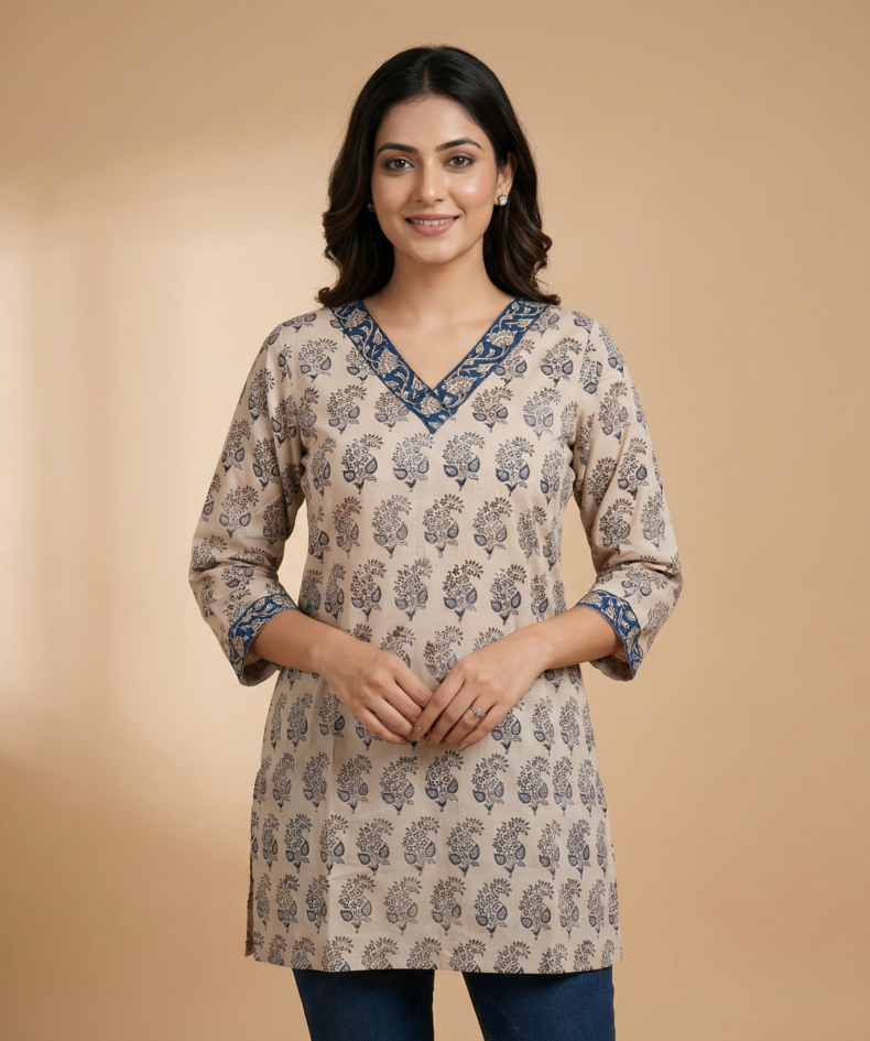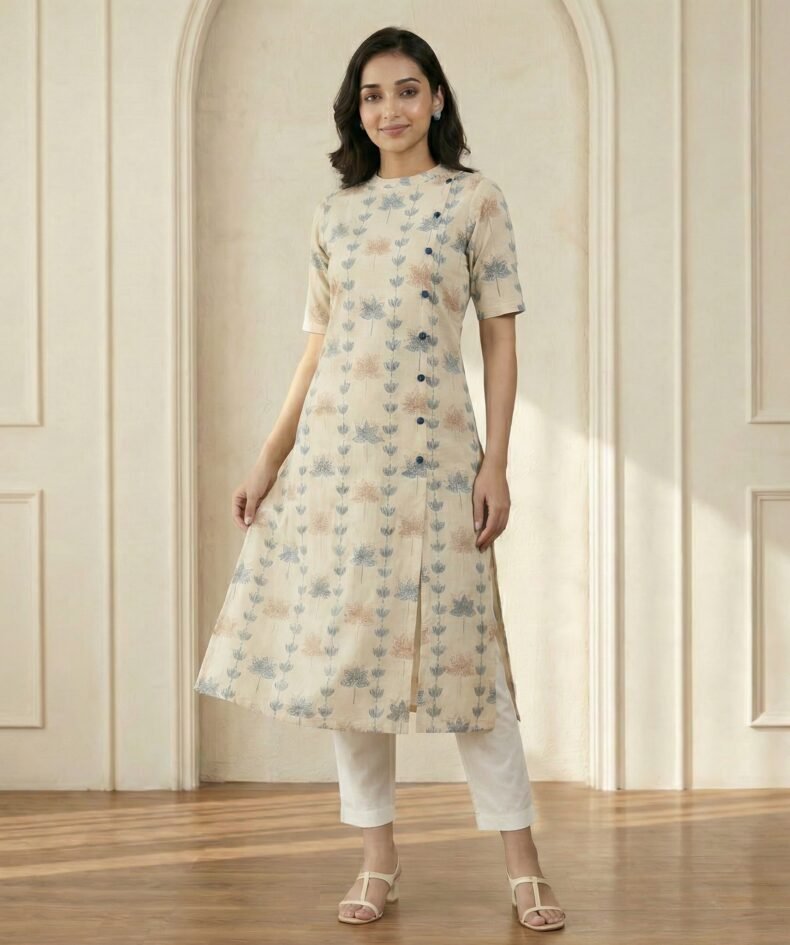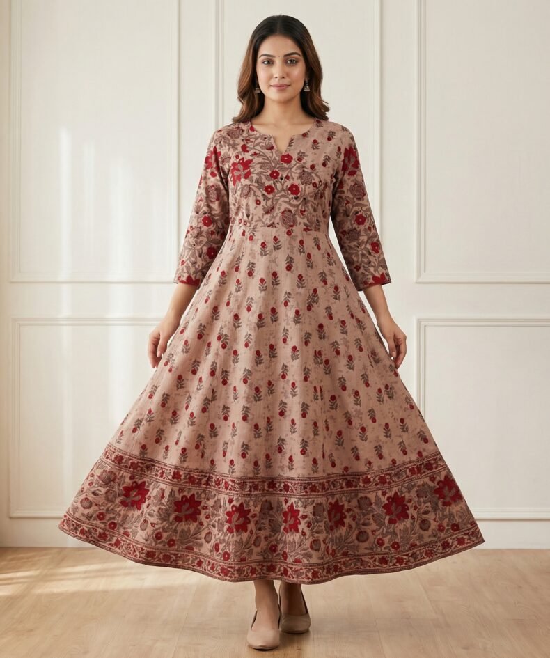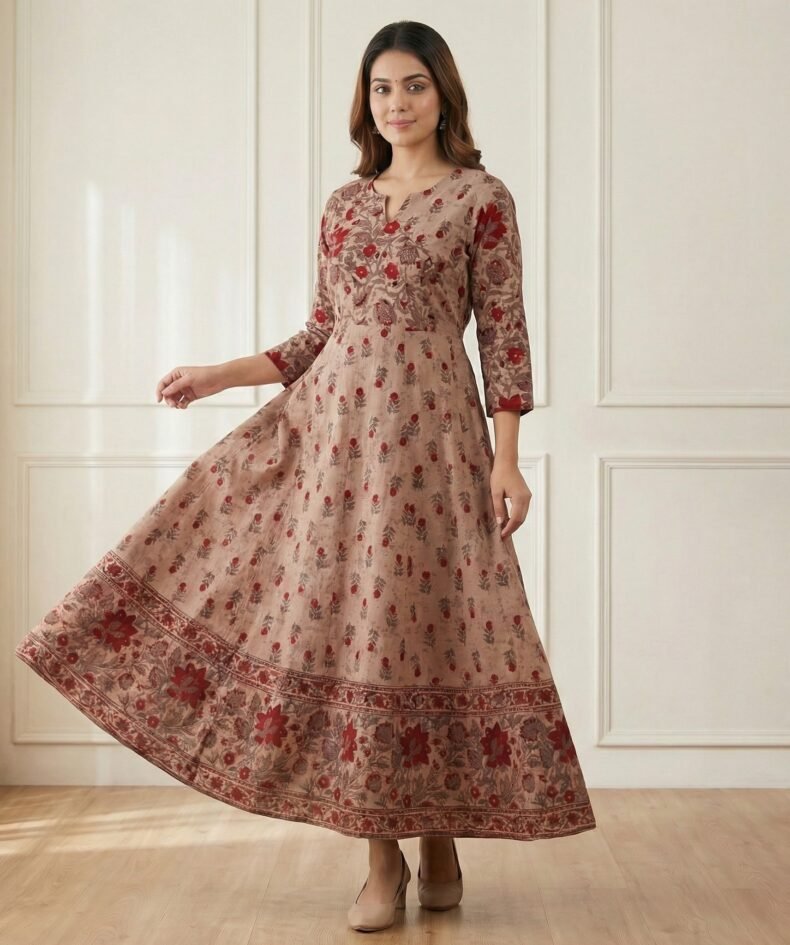 Beige Floral Cotton Anarkali Kurti with Wide Flare & Printed Hem Border
