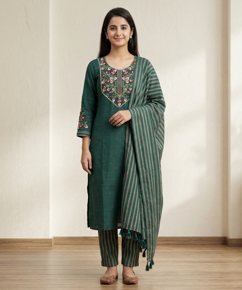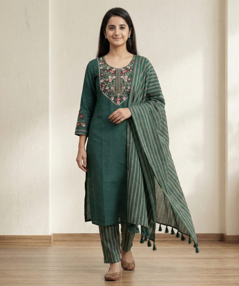 Elegant Green Cotton Kurta Set with Embroidered Neck & Striped Dupatta