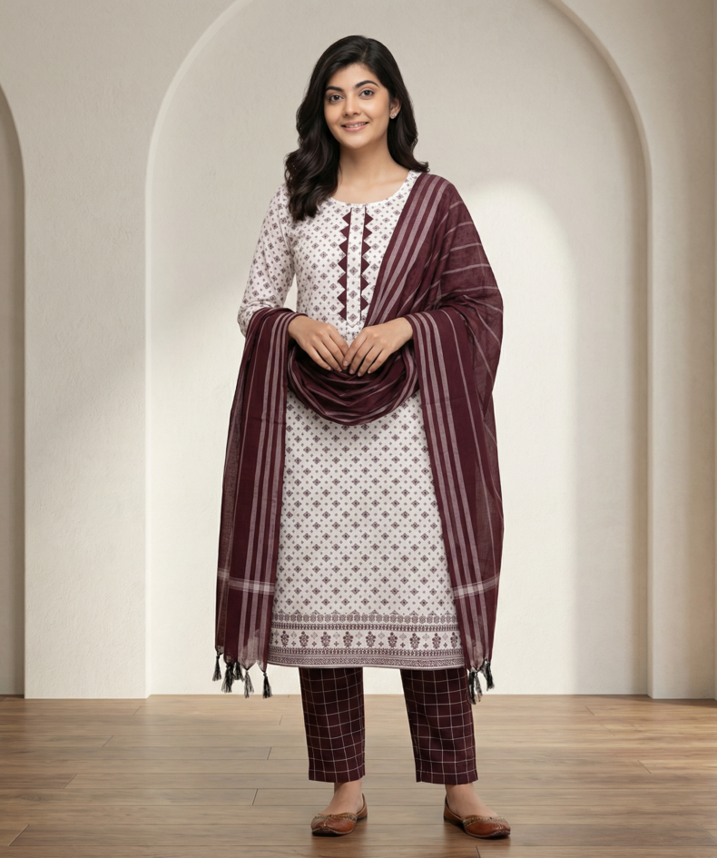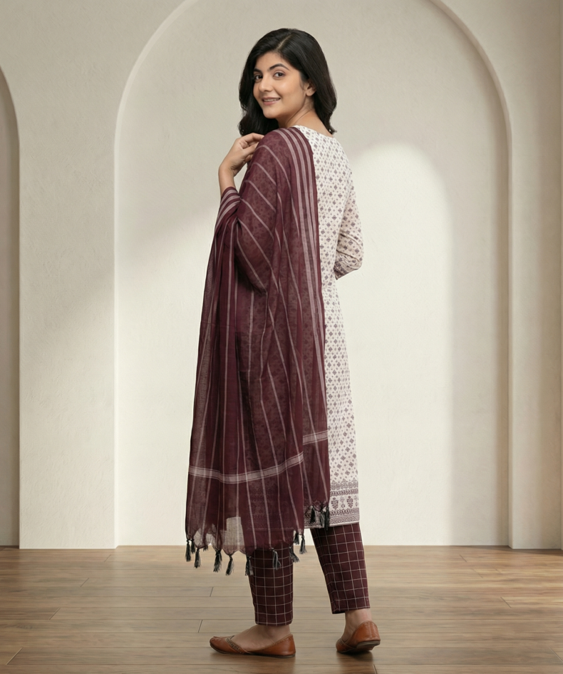 White Printed Cotton Kurta Set with Brown Pants & Maroon Dupatta