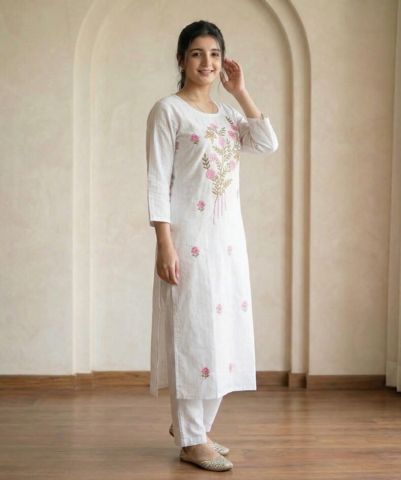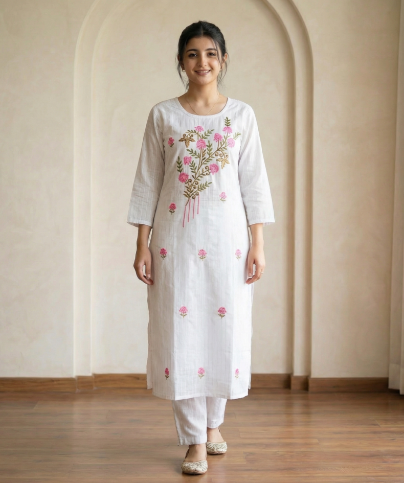 White Cotton Floral Embroidered Kurti – Elegant Straight Fit Ethnic Wear