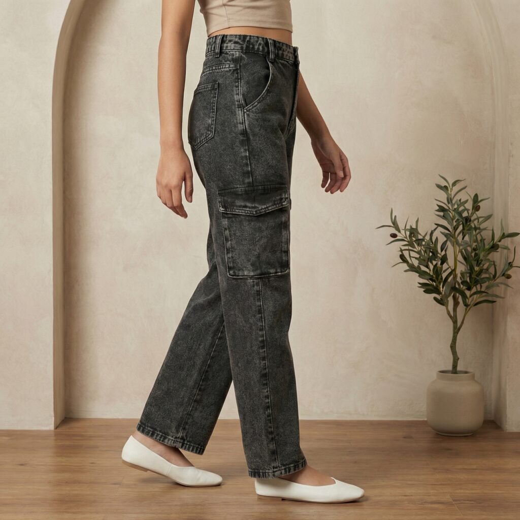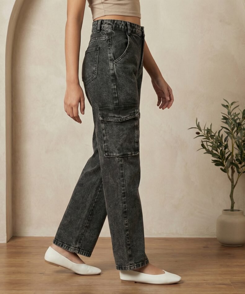 Black Acid Wash Wide-Leg Cargo Jeans – High-Rise Elastic Waist Denim