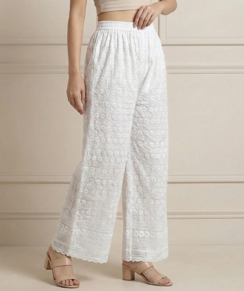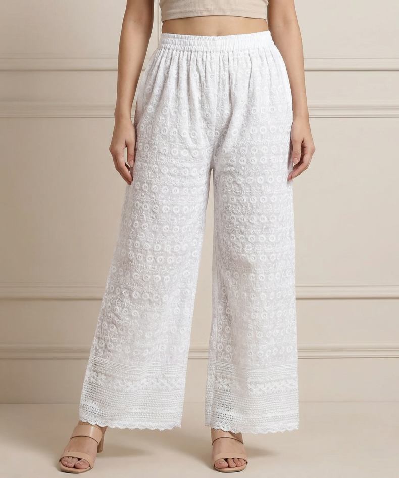 White Heavy Embroidered Cotton Wide-Leg Palazzo Pants for Women