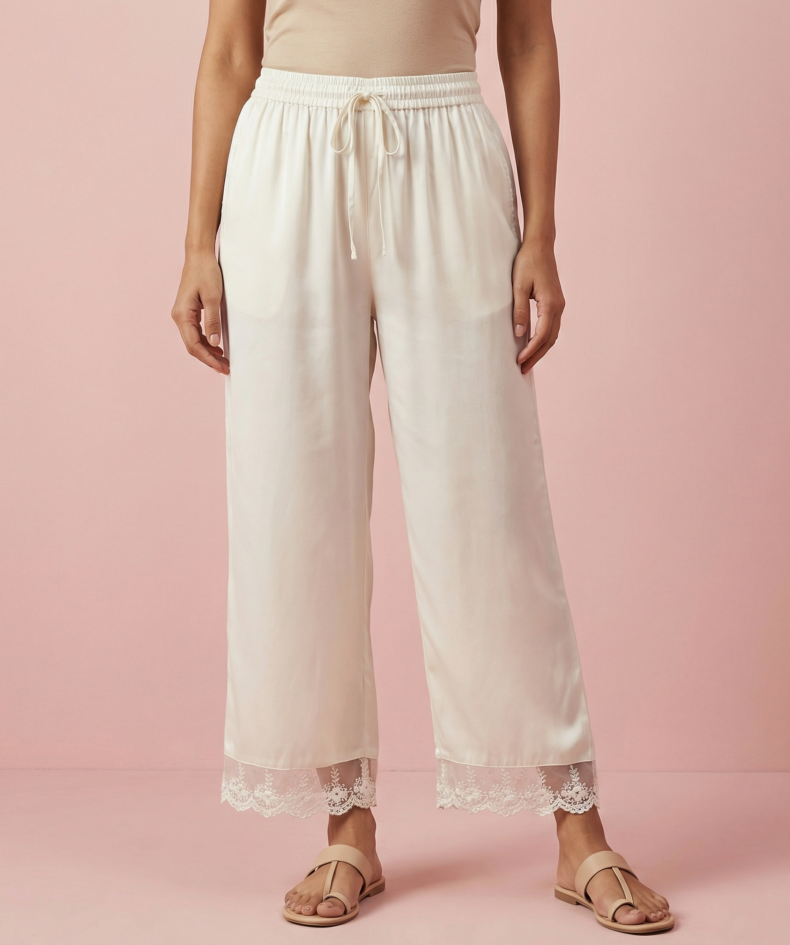 Ivory Satin Lace Hem Palazzos – Elastic Waist Wide Leg Pants