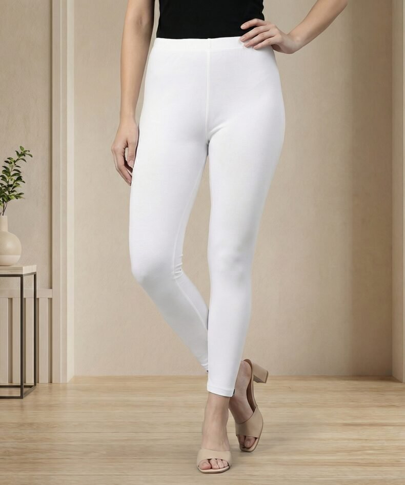 Solid White High-Waist Stretch Cotton Leggings – Ankle Length Slim Fit