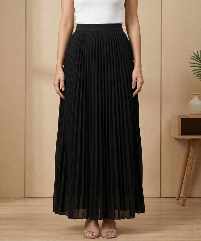 Black High-Waist Pleated Maxi Skirt – Flowy A-Line Elegant Long Skirt