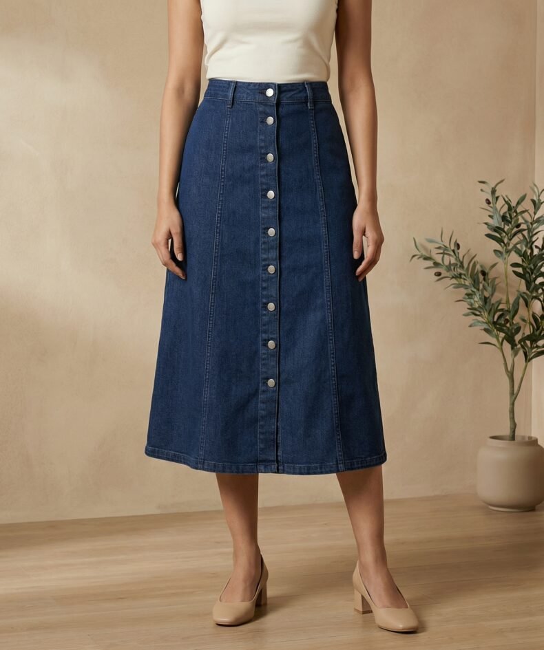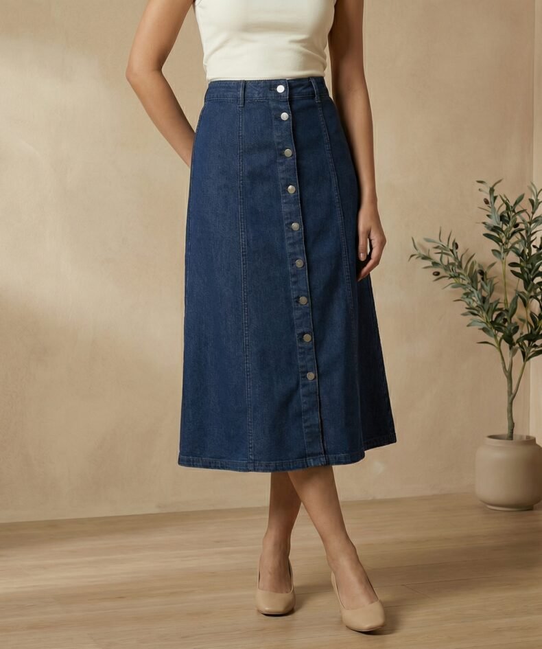 Dark Indigo Button-Front A-Line Denim Midi Skirt