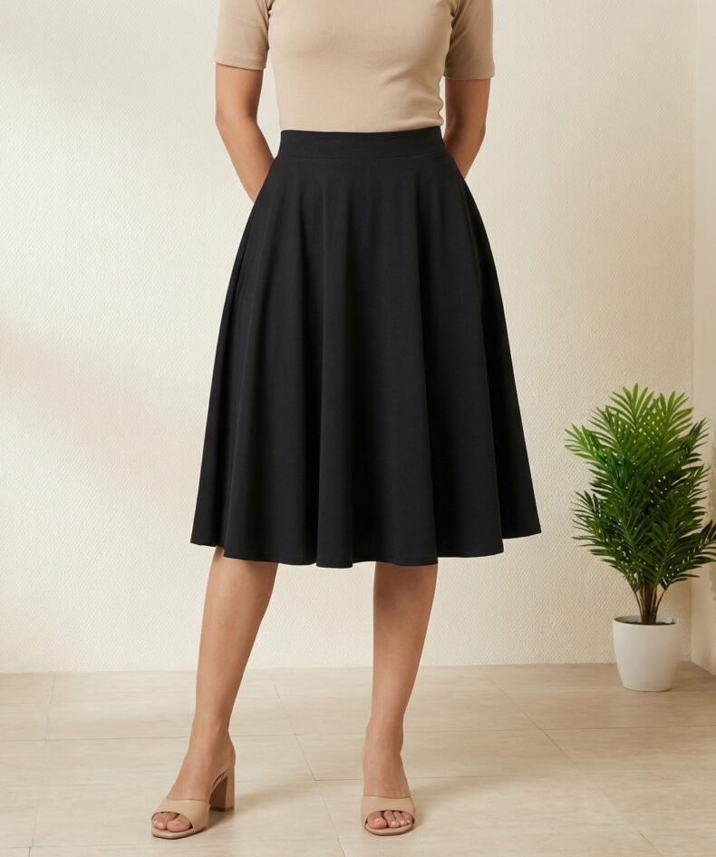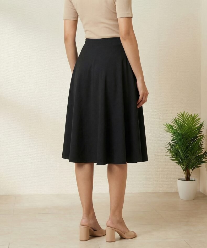 Black Flared Midi Skirt – Premium A-Line Knee Length