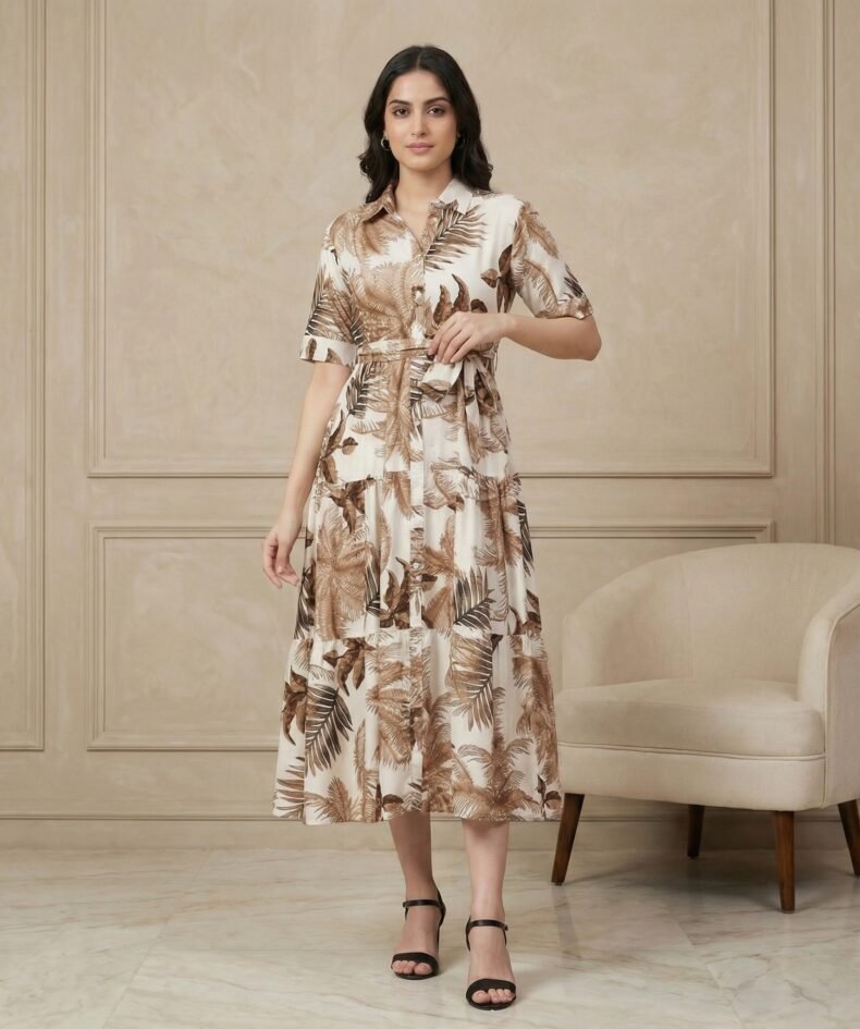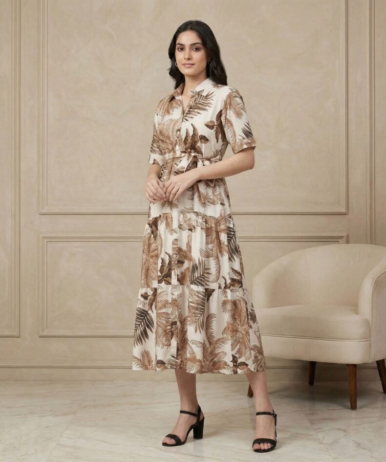 Cream Tropical Leaf Print Midi Shirt Dress with Waist Tie