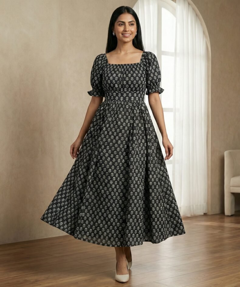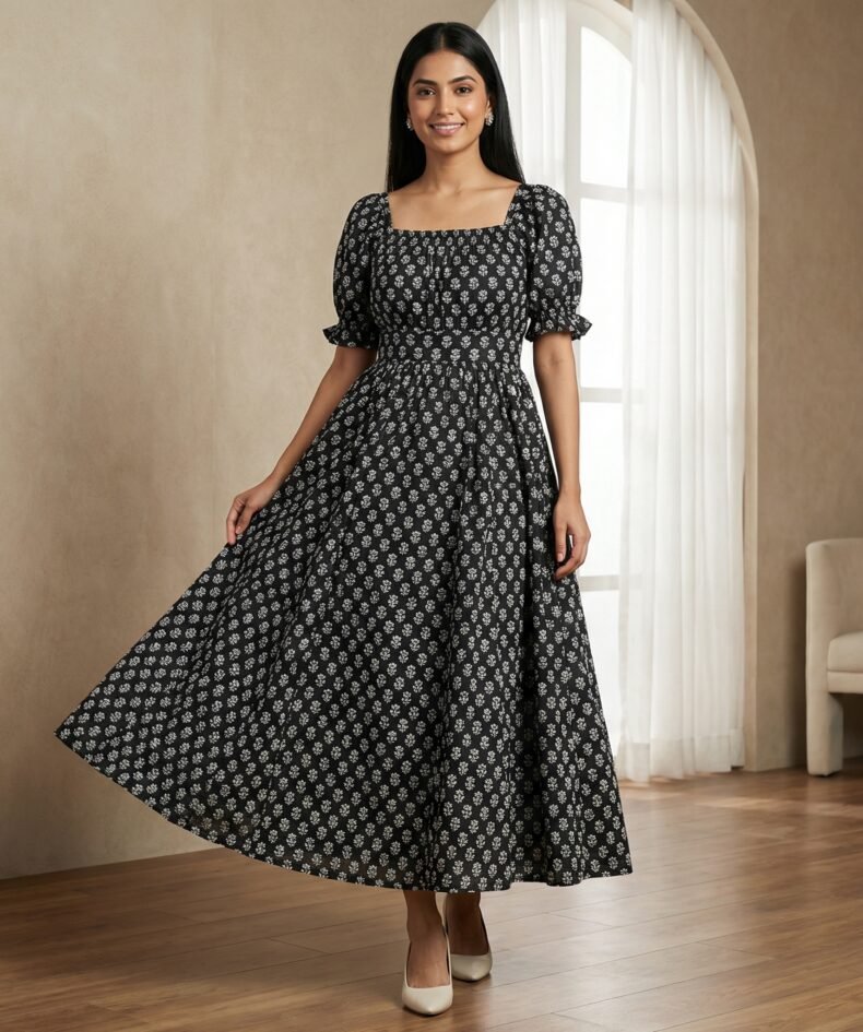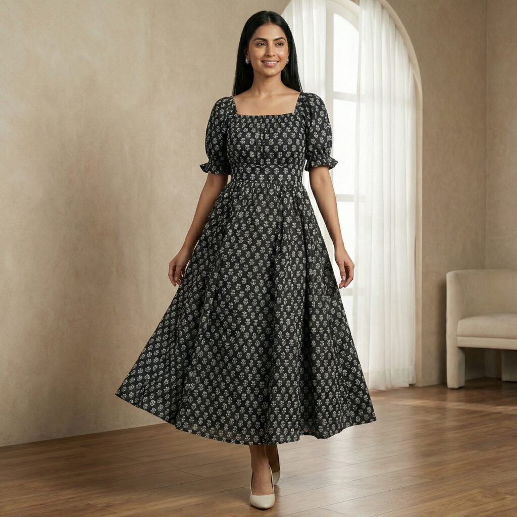 Black Floral Print Cotton Flared Maxi Dress for Women – Puff Sleeve Square Neck