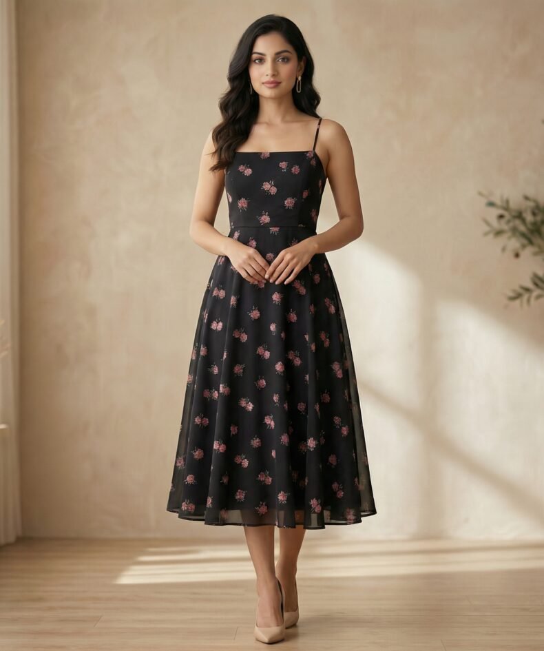 Black Floral Print Crepe Midi Dress – Square Neck Fit & Flare