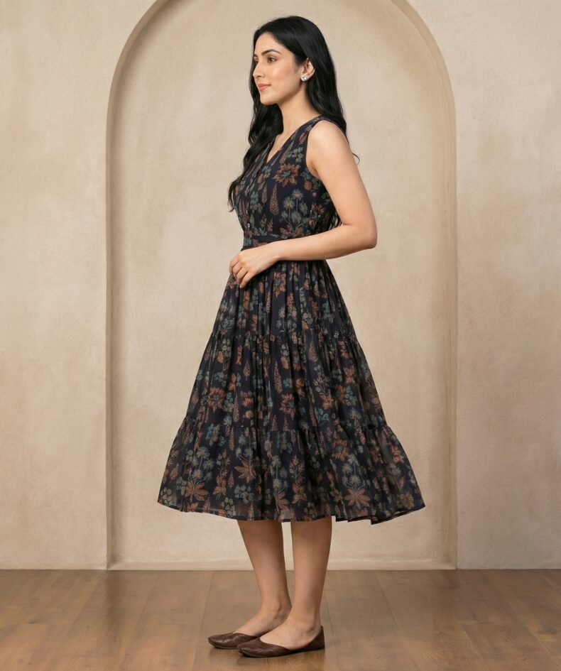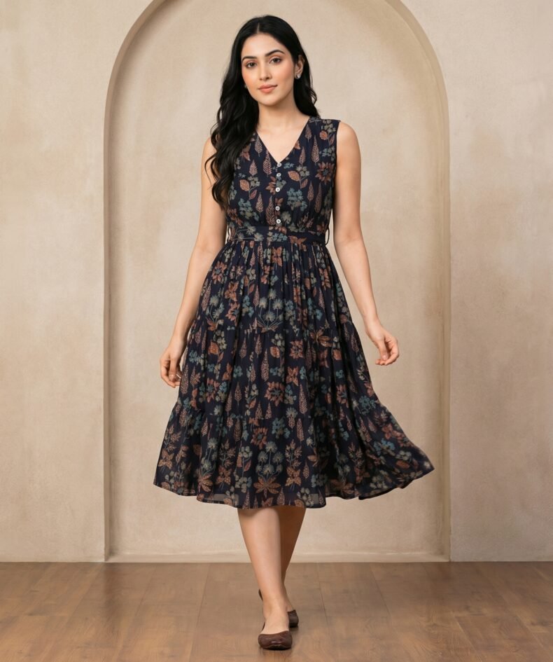 Navy Floral Sleeveless Midi Dress – V-Neck Fit & Flare