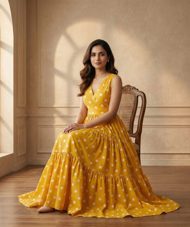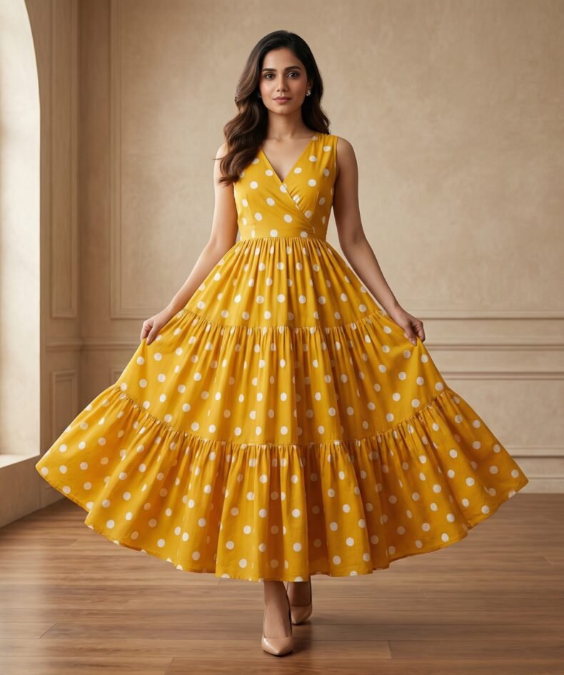 Mustard Yellow Polka Dot Midi Gown – Sleeveless Flowy Dress