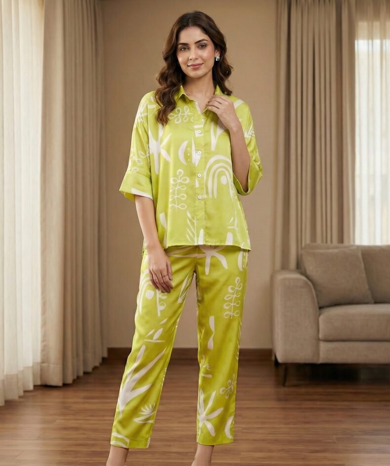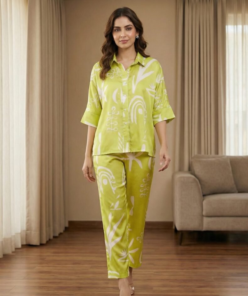 Lime Green Satin Abstract Printed Co-Ord Set – Relaxed Shirt & Ankle Pants