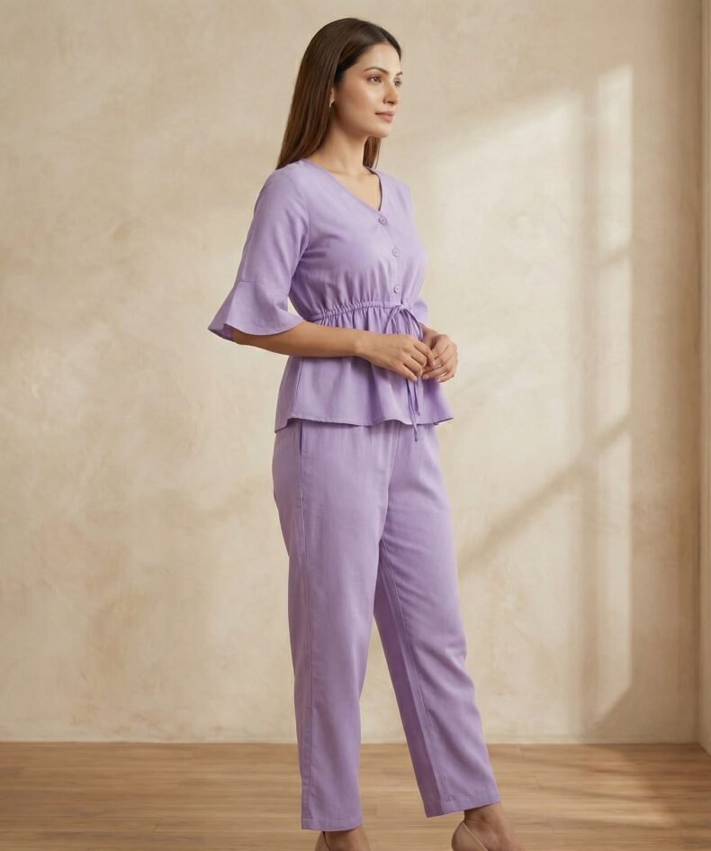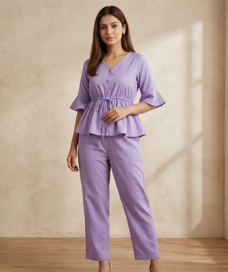 Lavender Crepe Peplum Top & Straight Pant Co-Ord Set