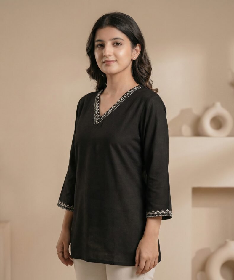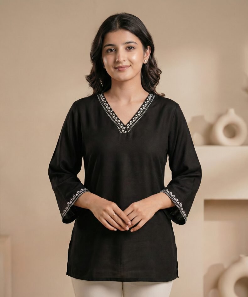 Elegant Black Embroidered V-Neck Short Kurti
