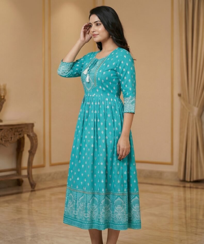 Teal Rayon Anarkali Kurti with Printed Border & Tassel Neckline