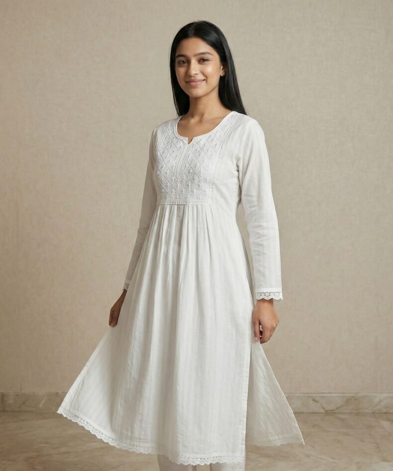 White Cotton Embroidered Anarkali Kurti with Lace Hem