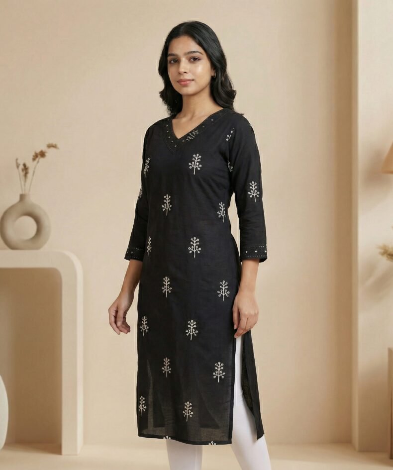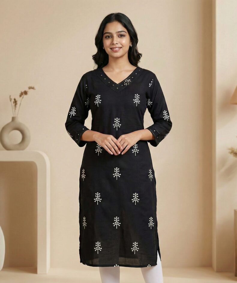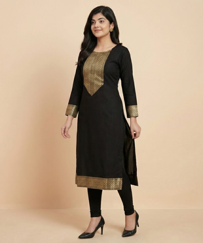 Black Straight Kurti with Gold Embroidery Panel – Elegant Ethnic Wear