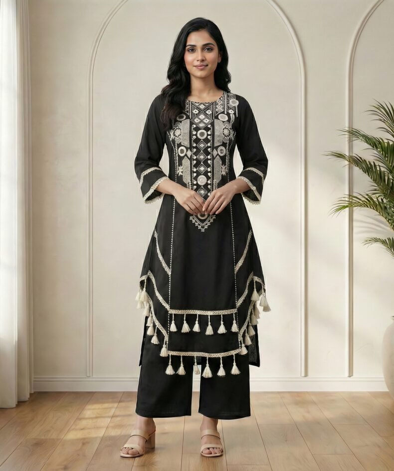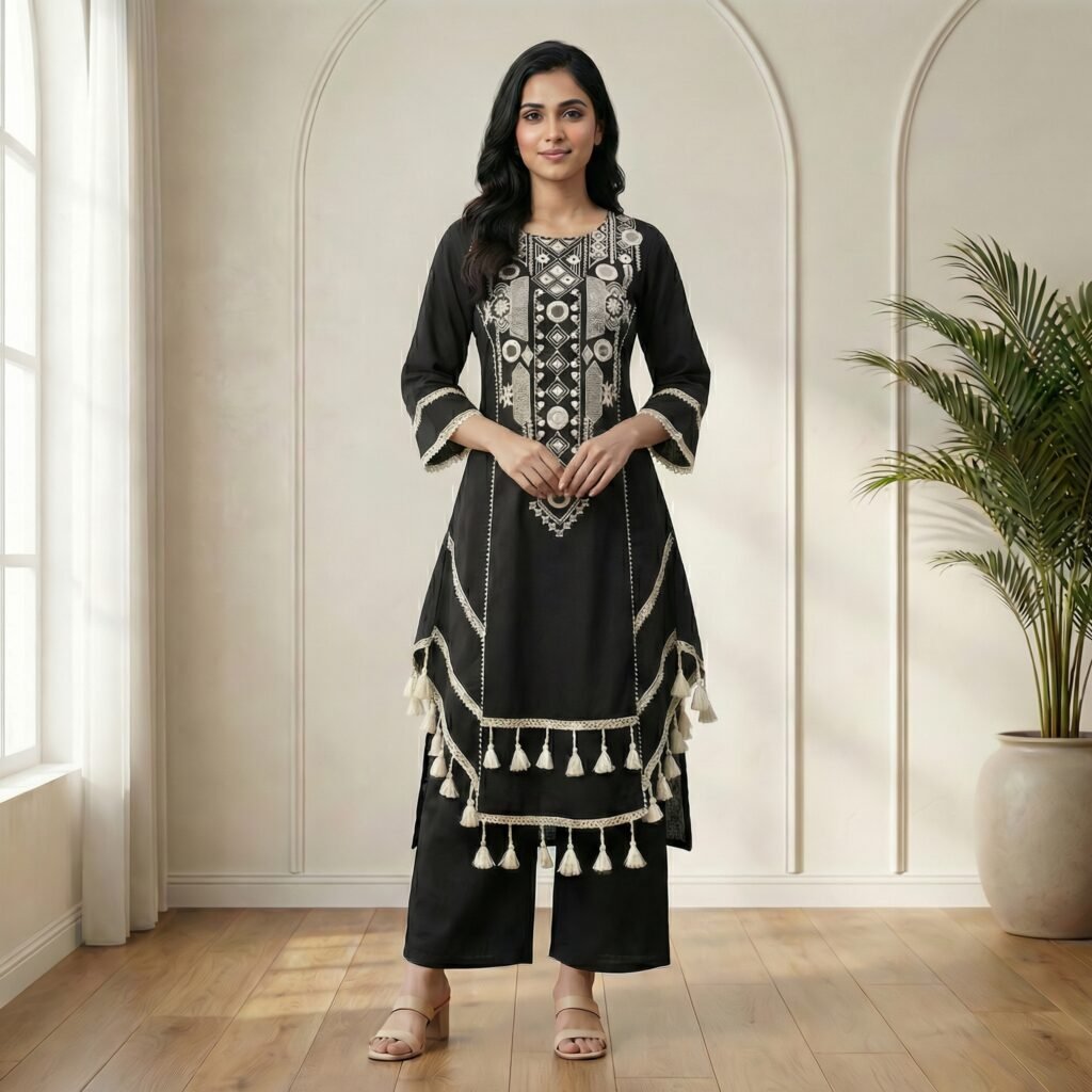 Black Embroidered Kurta Palazzo Set with Tassel Detailing