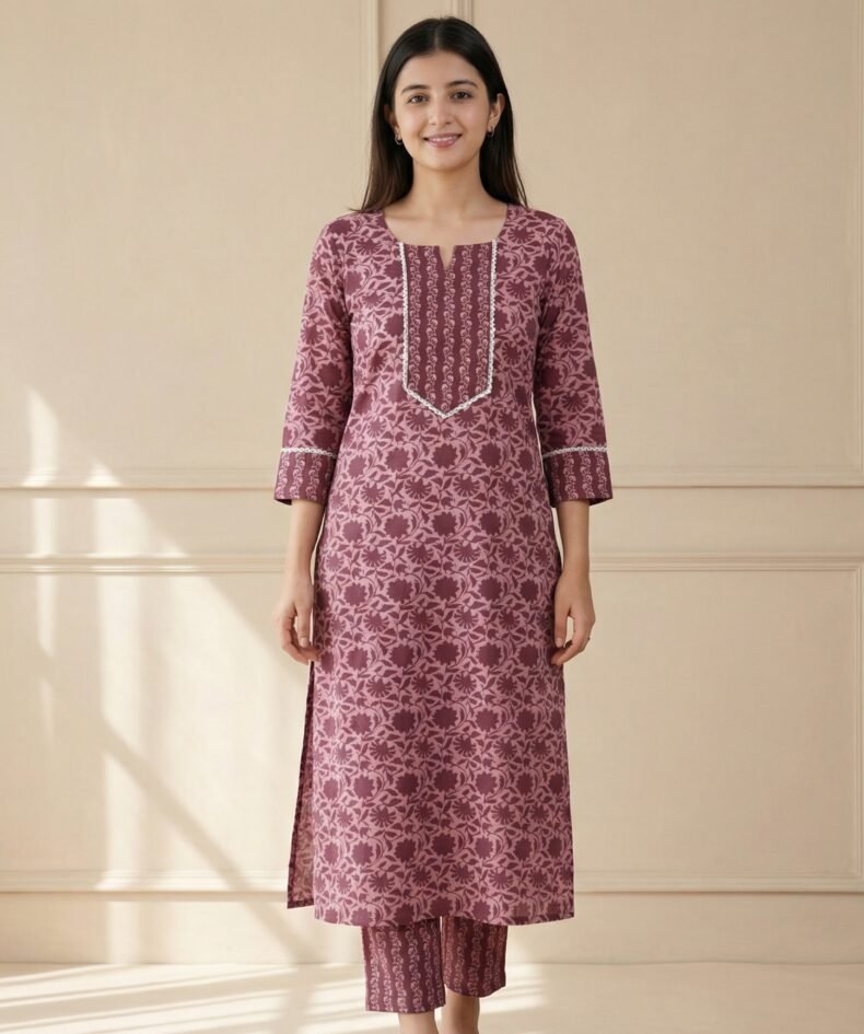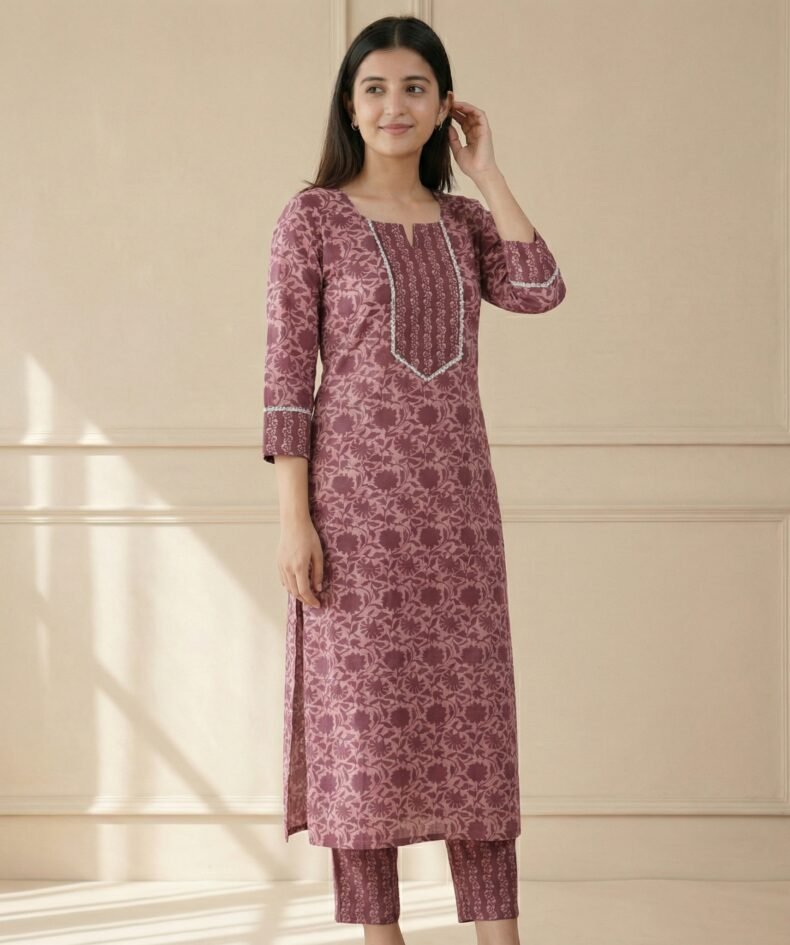 Mauve Floral Printed Kurta Pant Set for Women – Elegant Ethnic Wear