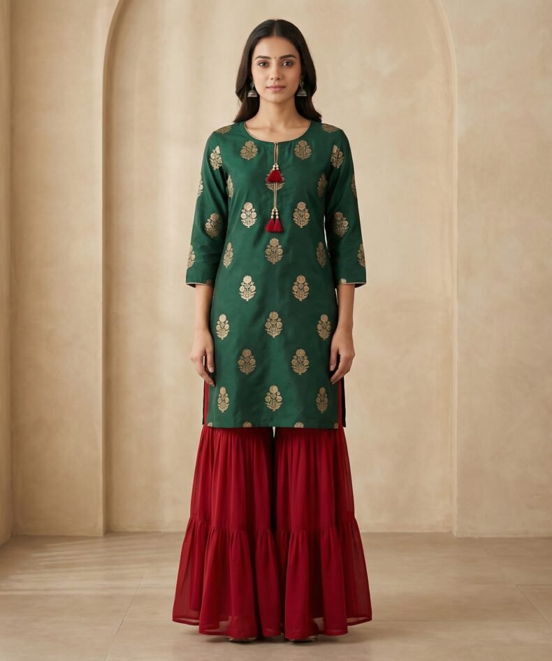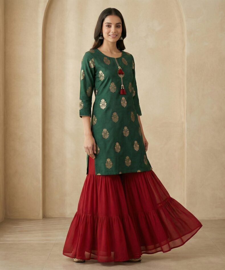Emerald Green Gold Buti Kurta with Red Georgette Sharara Set