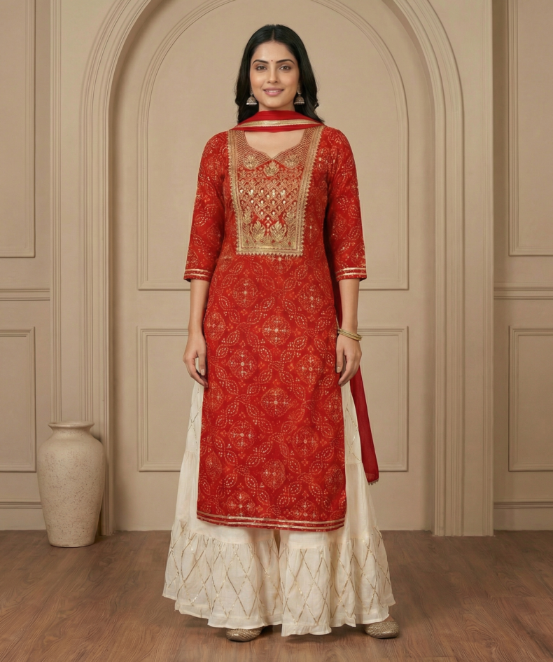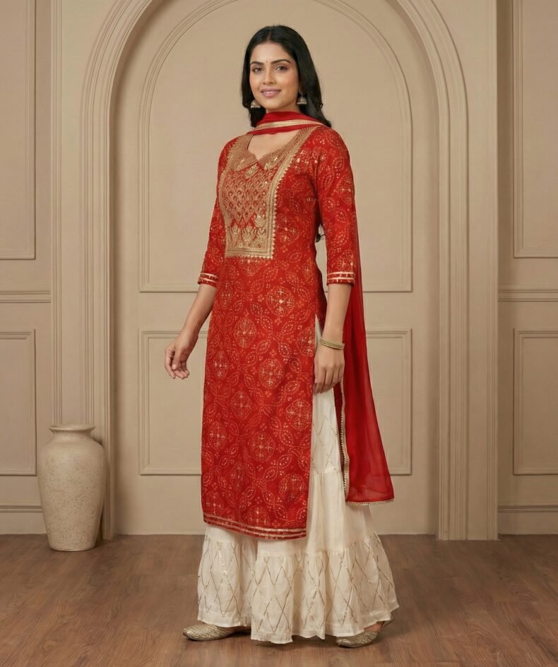Red Embroidered Sharara Set with Cream Flared Bottom & Dupatta