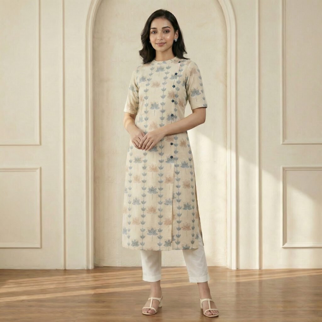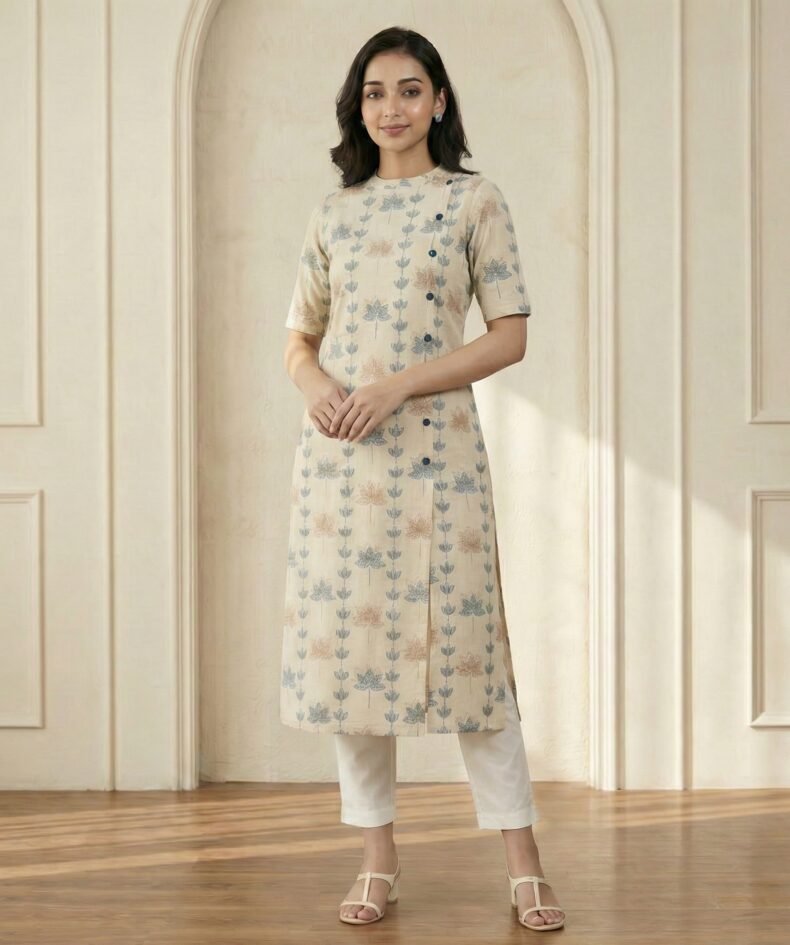 Beige Floral Printed Cotton Kurta Pant Set for Women