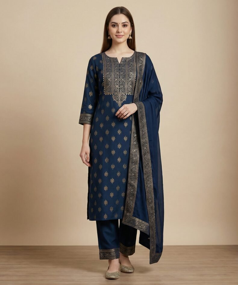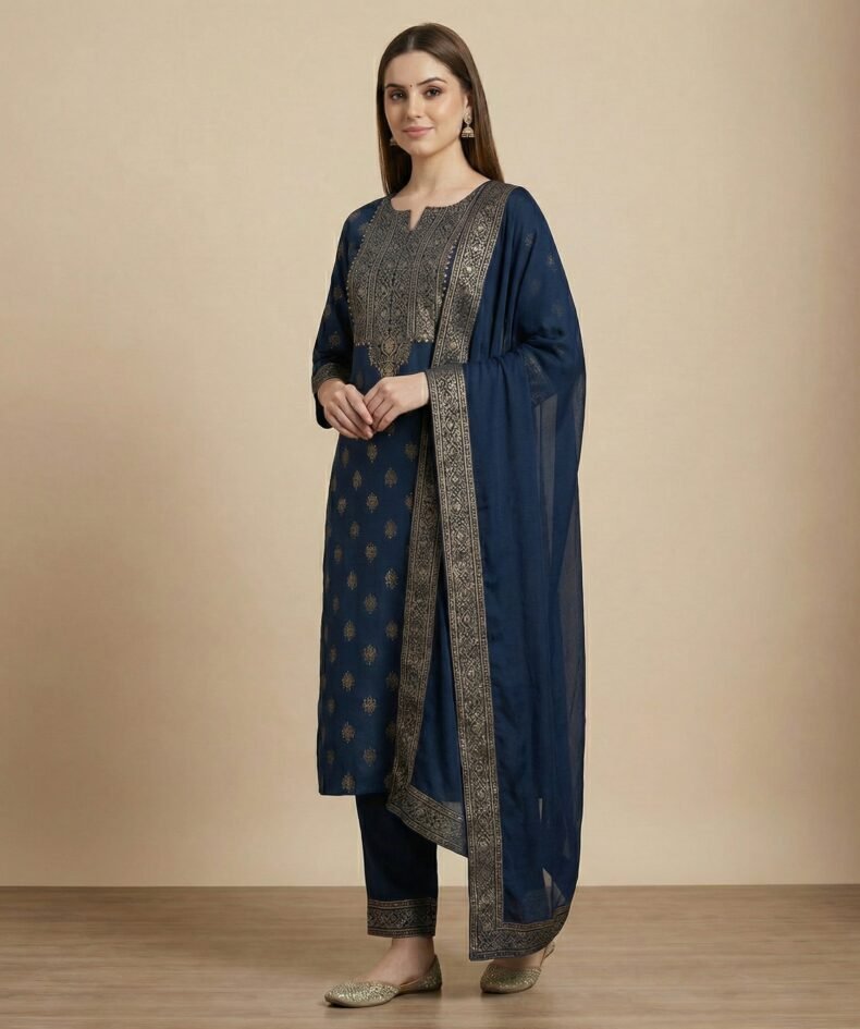Navy Blue Zari Embroidered Kurta Set with Dupatta & Straight Pants
