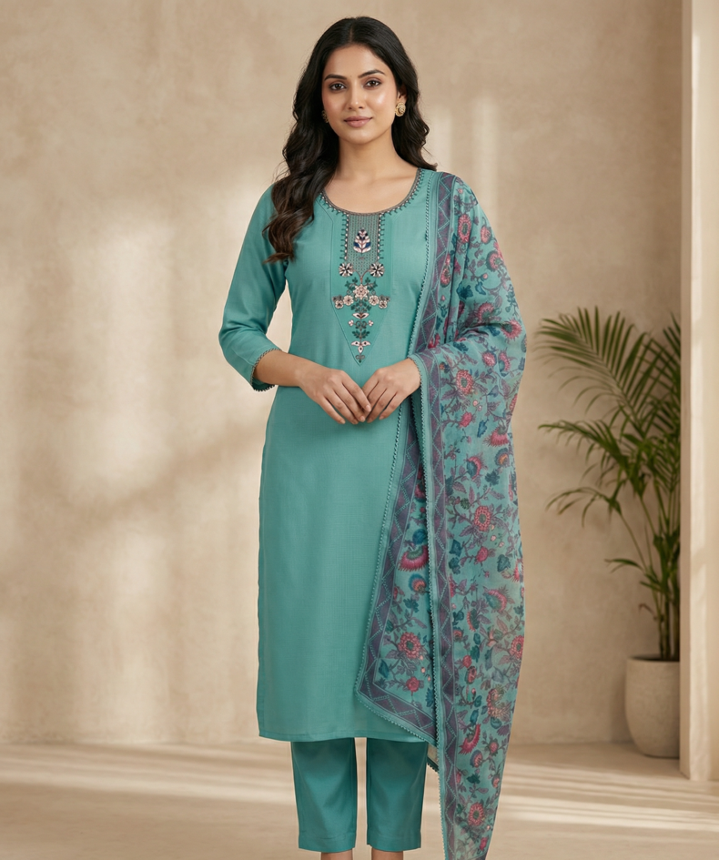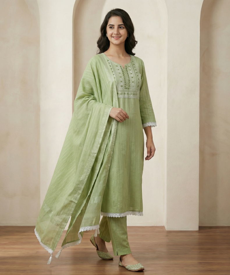 Light Green Embroidered Cotton Kurta Set with Dupatta