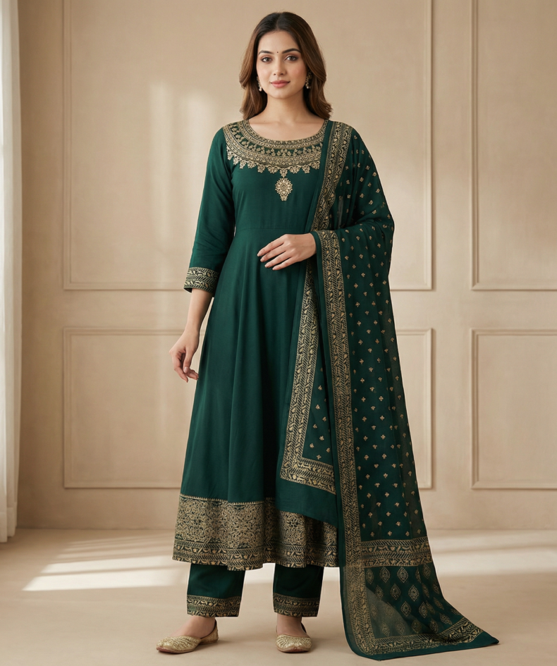 Emerald Green Rayon Anarkali Kurta Set with Zari Embroidery & Dupatta