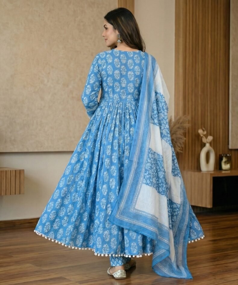 Sky Blue Handblock Cotton Anarkali Kurta Set with Dupatta