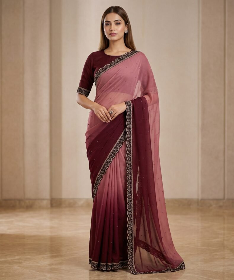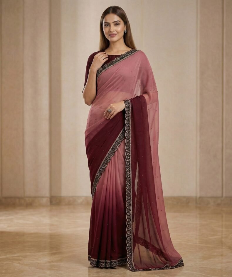 Wine & Dusty Rose Ombre Georgette Saree with Embroidered Lace Border
