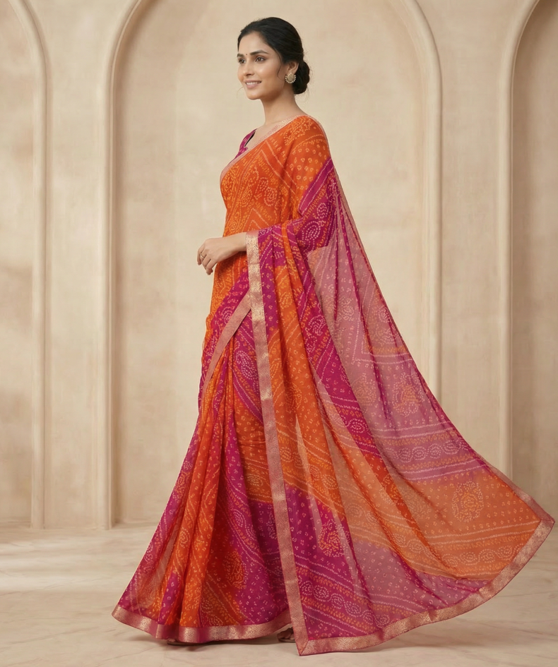 Orange & Magenta Georgette Saree with Ethnic Motifs & Designer Blouse