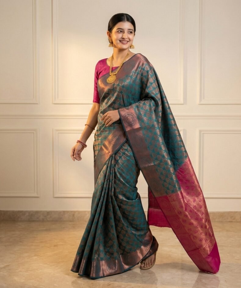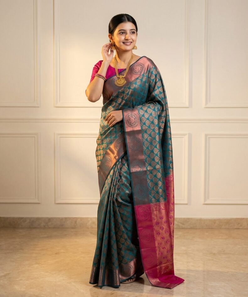 Premium Teal & Magenta Banarasi Silk Saree with Gold Zari Weaving