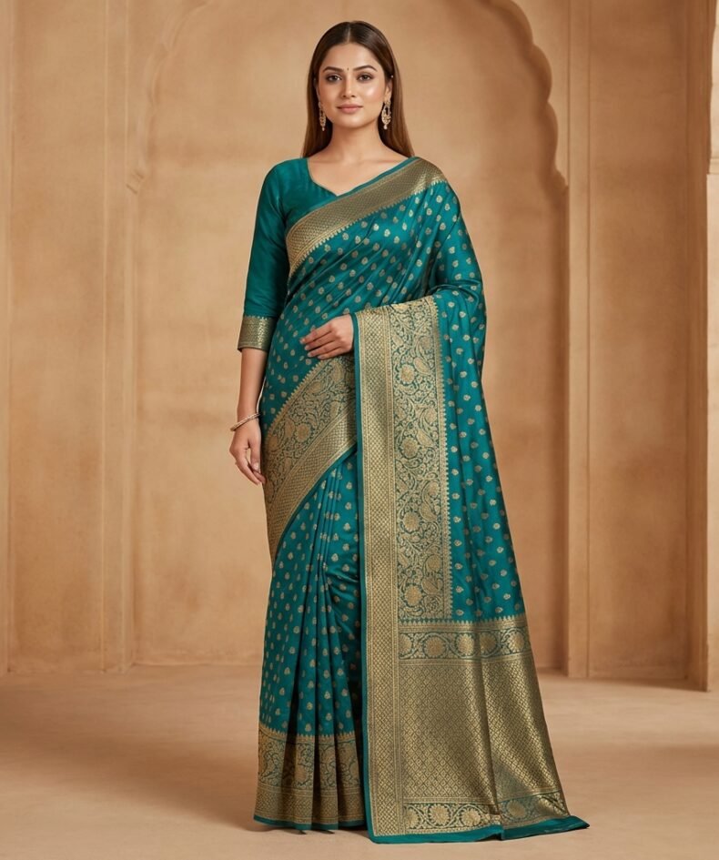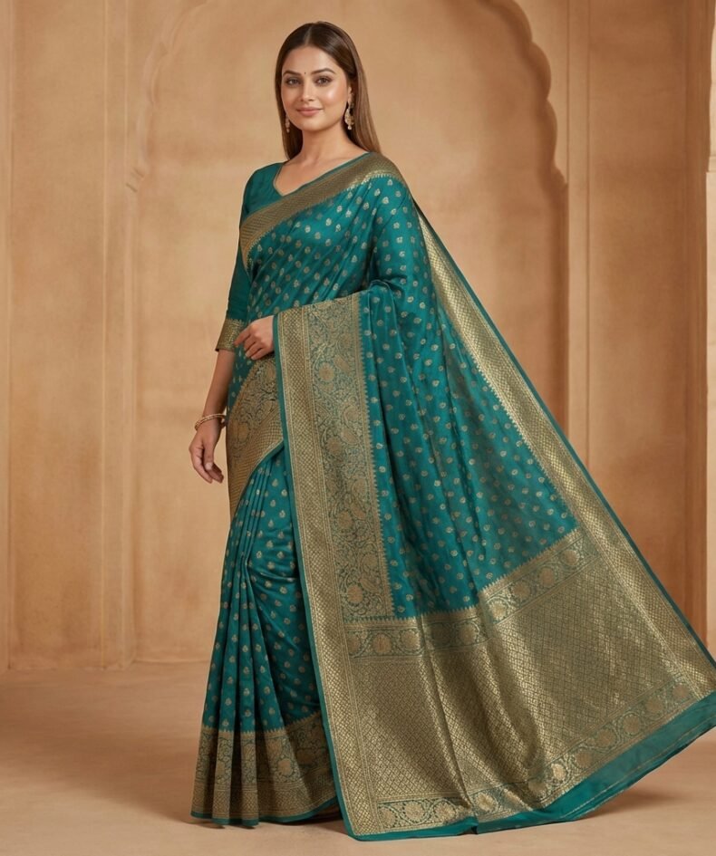 Teal Silk Saree with Antique Gold Zari Border & Rich Woven Pallu