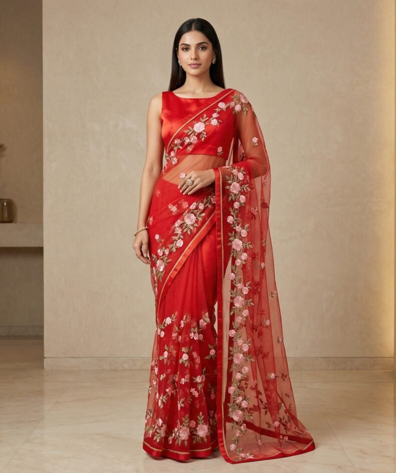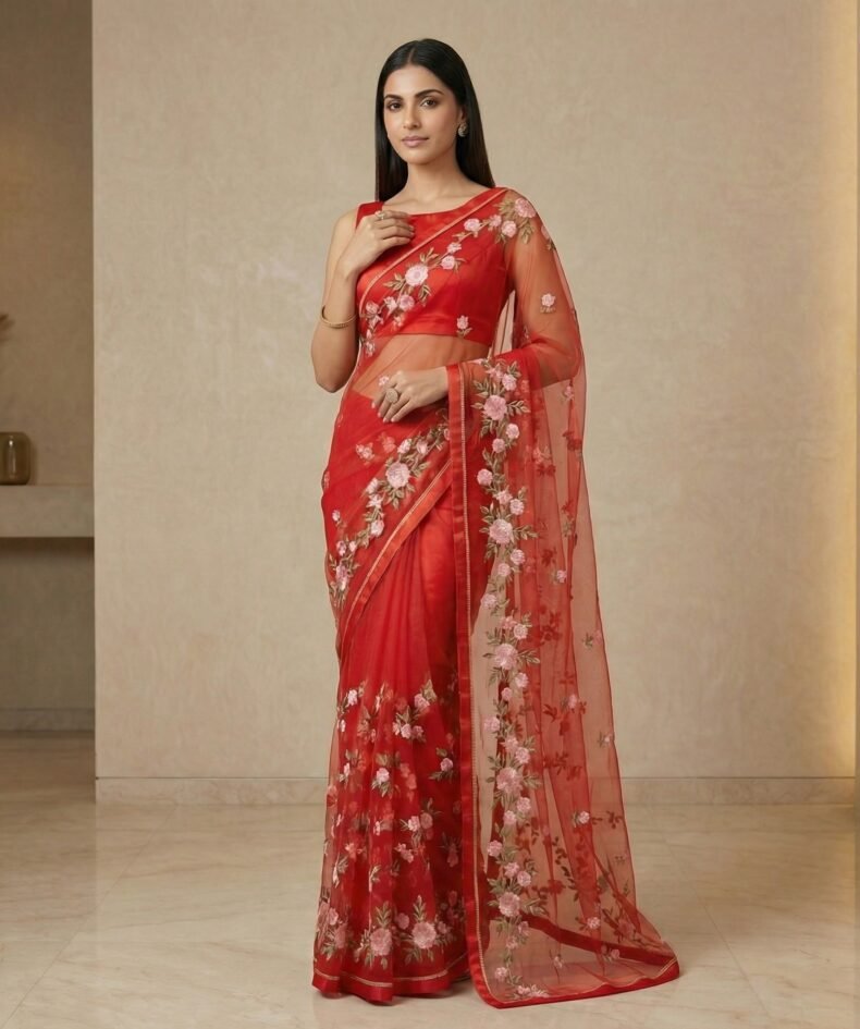 Vermilion Red Floral Embroidered Net Saree with Gold Trim Border