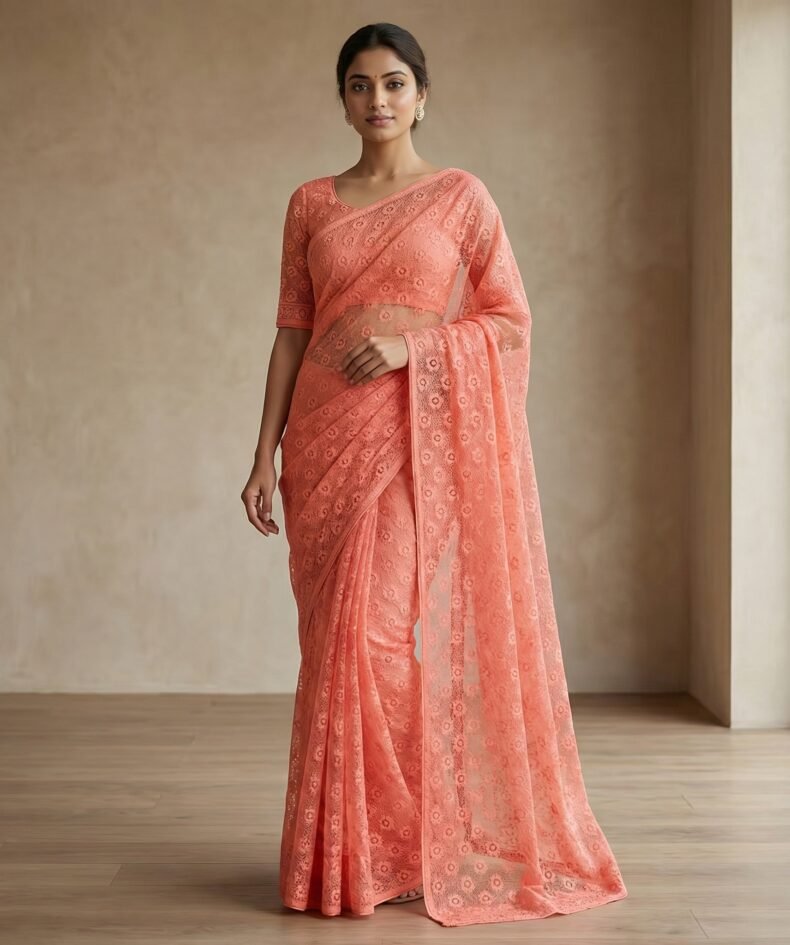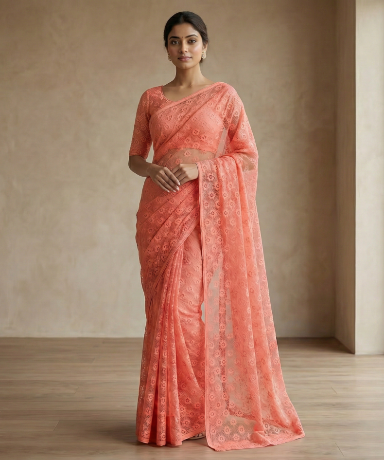 Peach Coral Floral Embroidered Net Saree with Matching Blouse