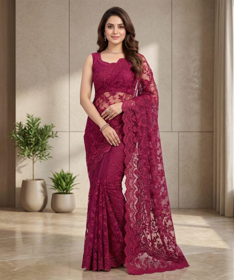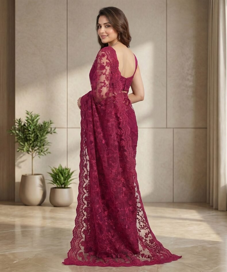 Deep Magenta Floral Embroidered Net Saree with Lace Border