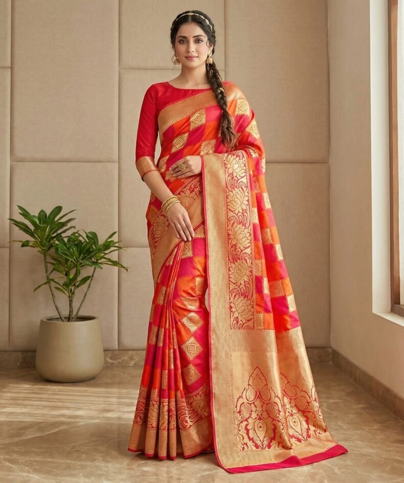 Red & Orange Soft Silk Saree with Gold Zari Border & Rich Pallu