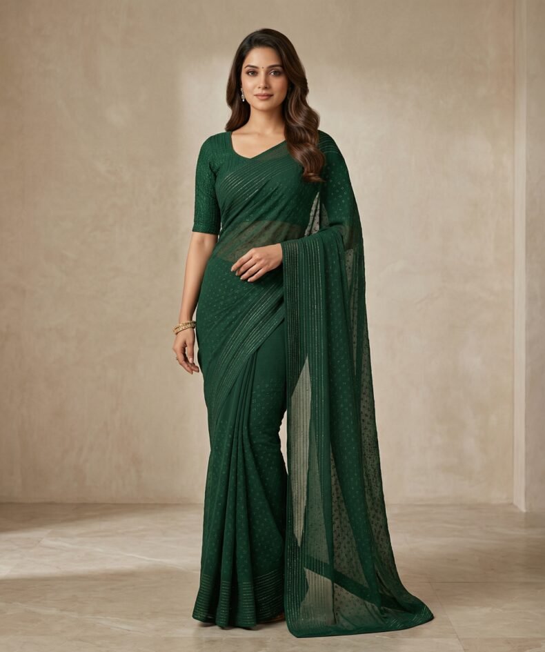 Forest Green Shimmer Chiffon Saree with Textured Half Sleeve Blouse
