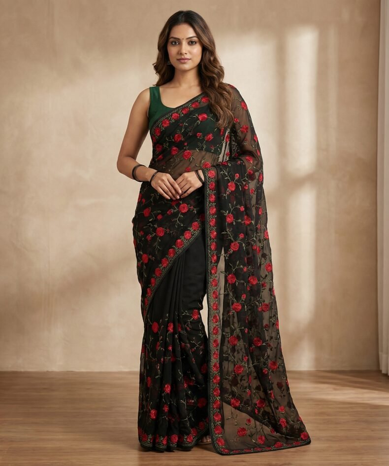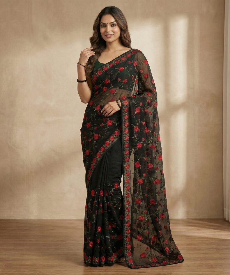 Black Chiffon Saree with Red Rose Embroidery & Green Sleeveless Blouse