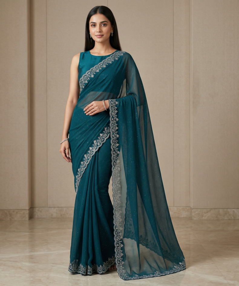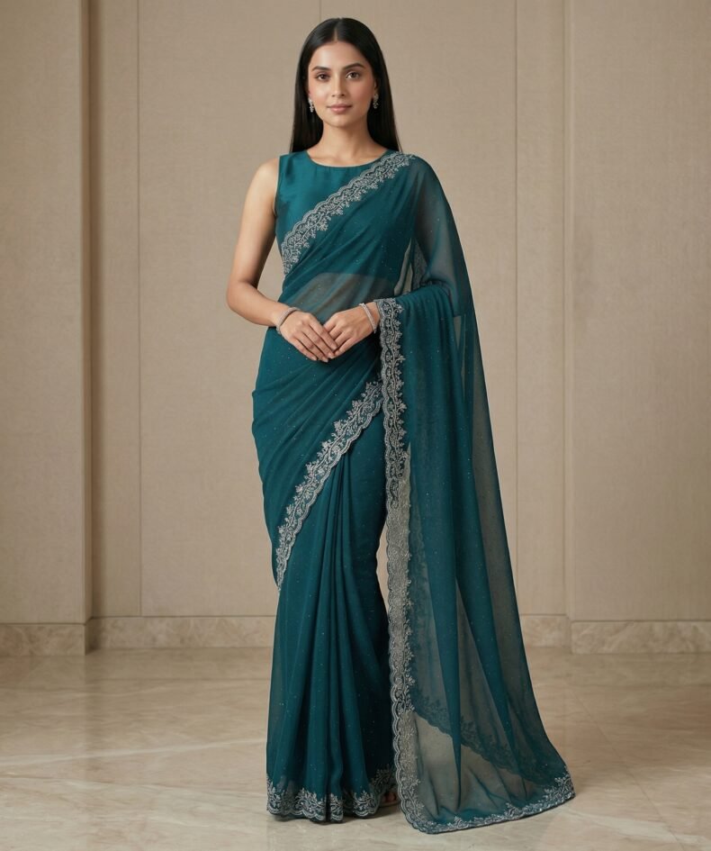Deep Teal Chiffon Saree with Silver Floral Embroidered Border