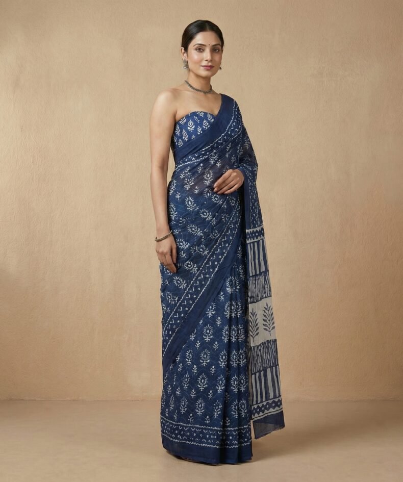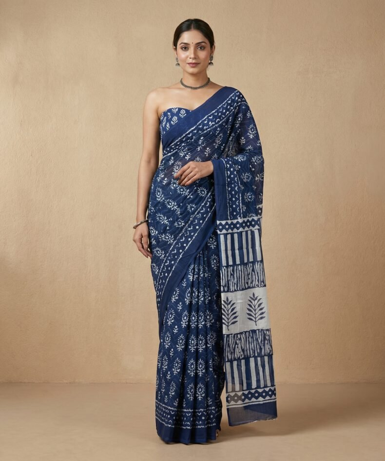 Blue Hand Block Printed Pure Cotton Saree with Contrast Pallu