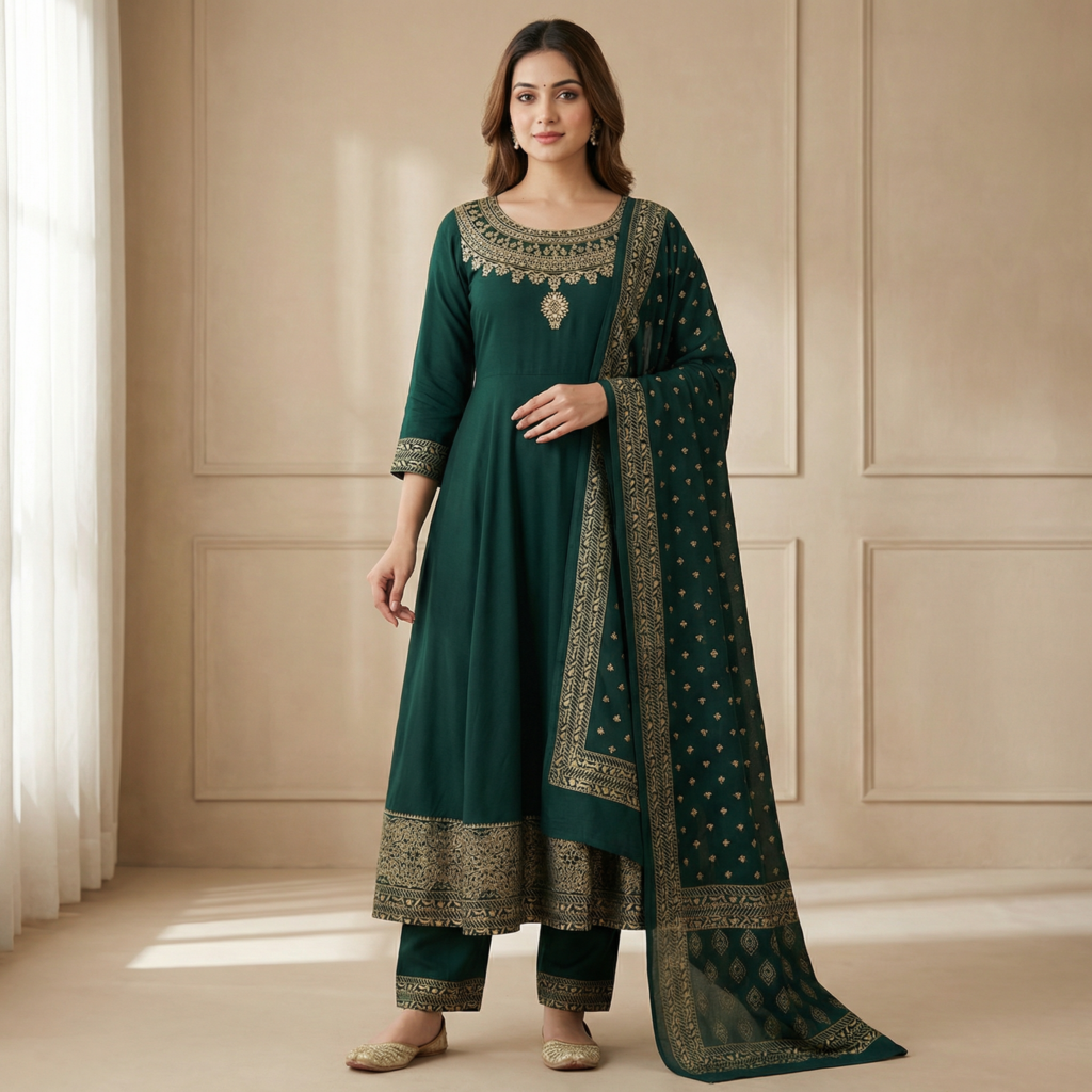 Emerald Green Rayon Anarkali Kurta Set with Zari Embroidery & Dupatta