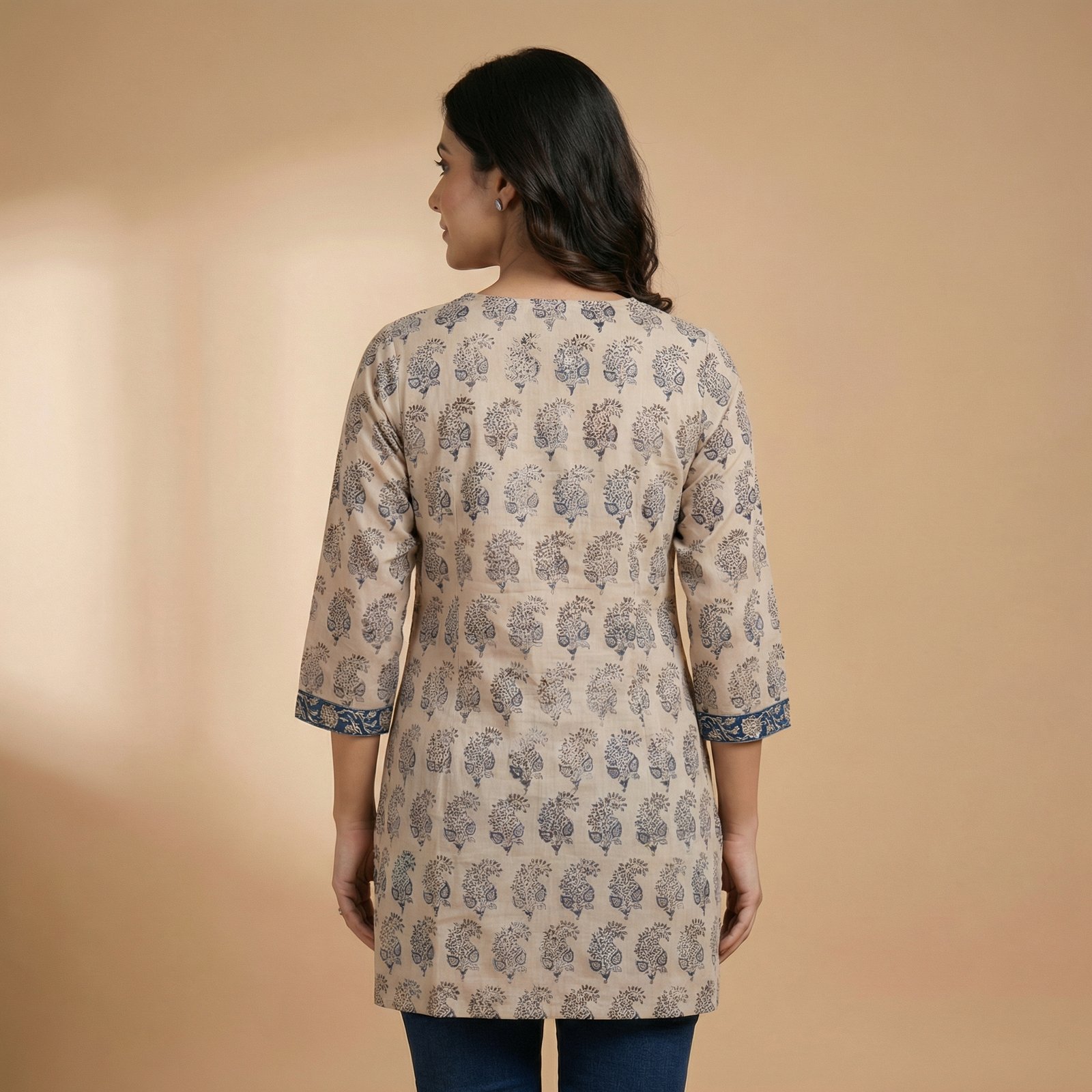 Elegant beige cotton short kurti with delicate blue floral print and contrast V-neck detailing. Comfortable, breathable, and perfect for everyday chic styling.