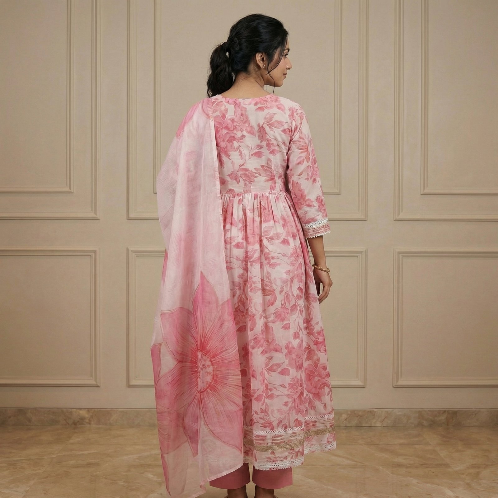 Graceful blush pink Anarkali set with floral prints, intricate neckline embroidery, and a soft organza dupatta. Perfect for festive events and elegant day occasions.