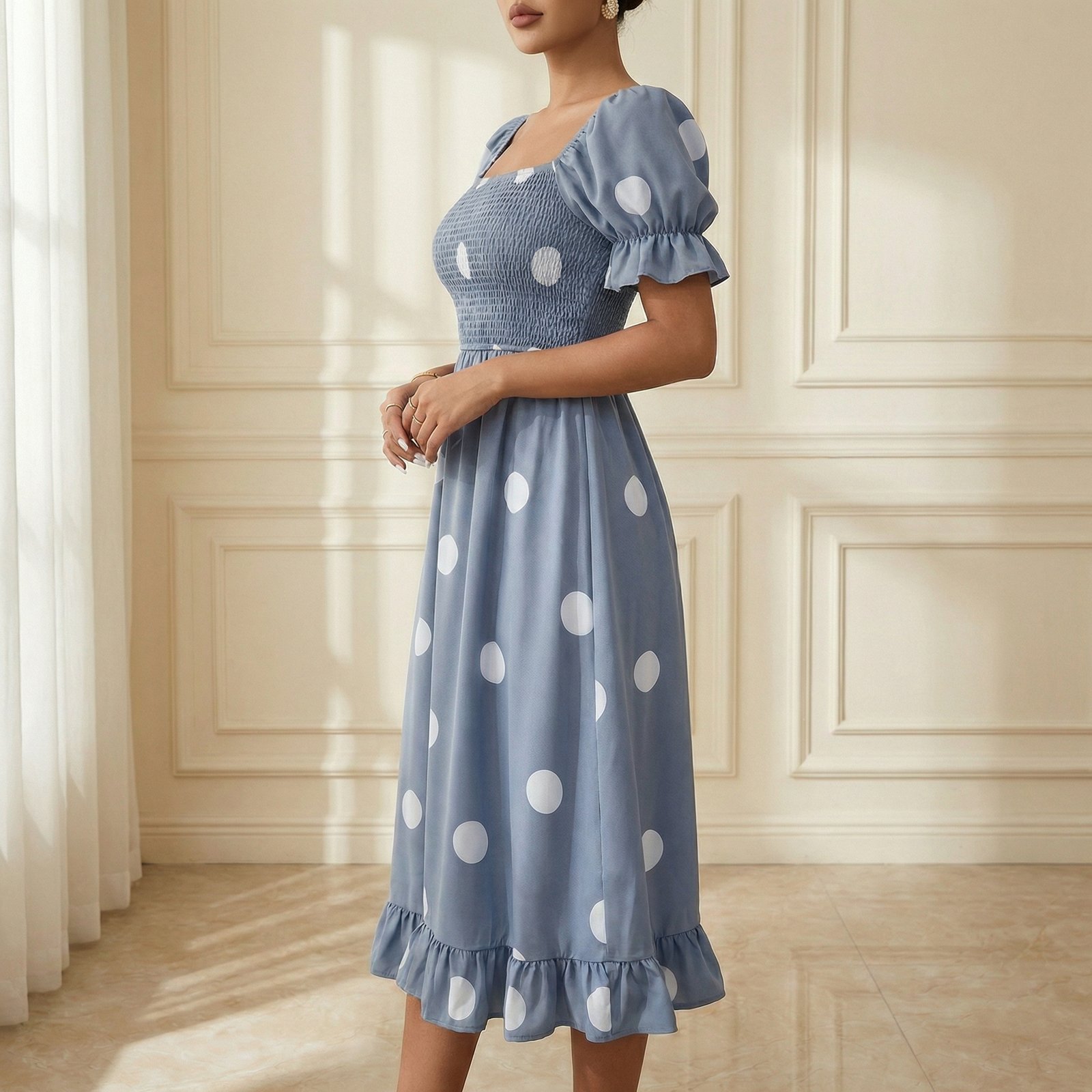Elegant dusty blue midi dress with white polka dots, smocked bodice, puff sleeves, and flowy ruffled hem. Lightweight, flattering, and perfect for summer outings.