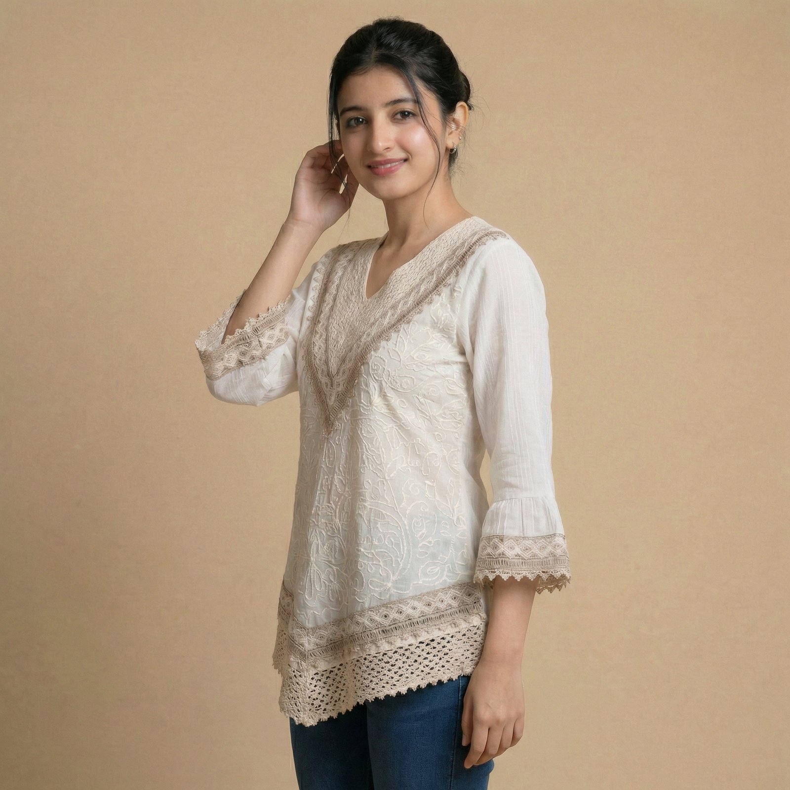 Soft beige V-neck lace top featuring delicate embroidery, crochet hemline and stylish bell sleeves. Perfect for casual outings or elegant everyday wear.