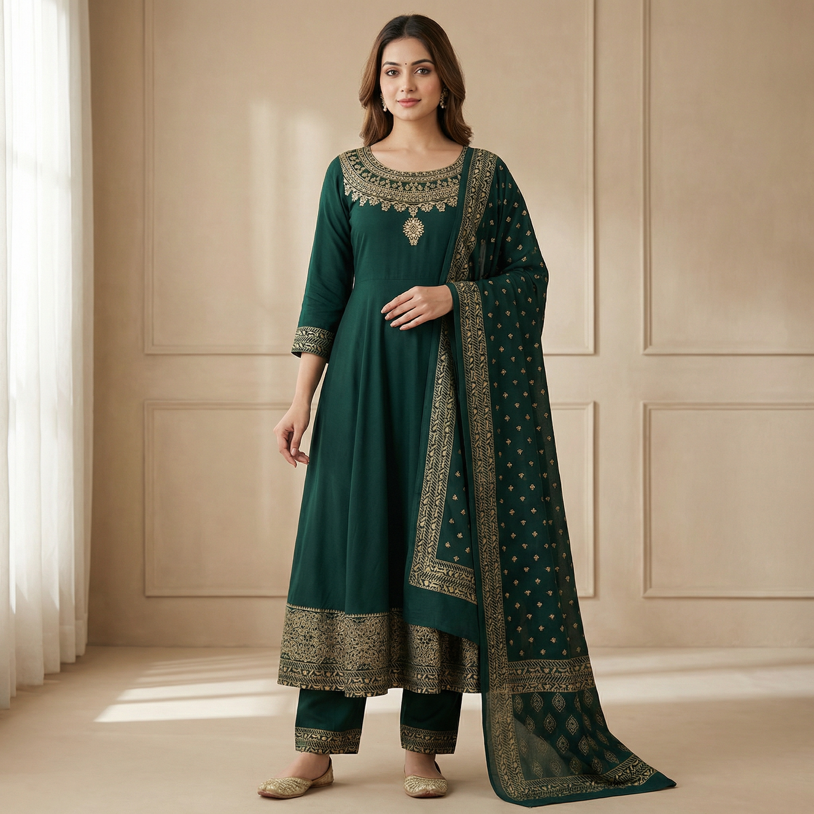Graceful emerald green rayon Anarkali kurta set featuring rich gold zari embroidery, flared silhouette, and matching dupatta. Ideal for festive and traditional occasions.