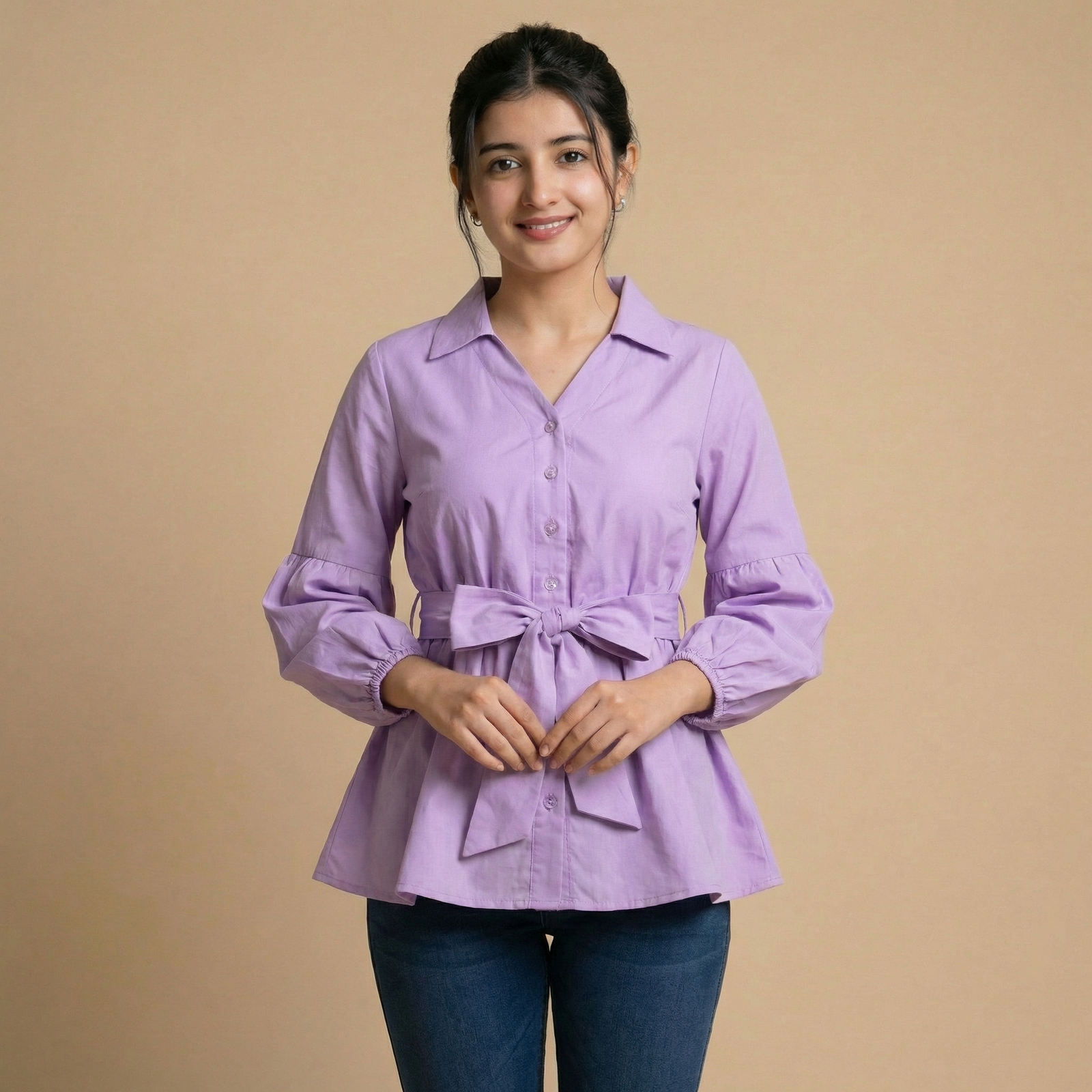Lavender Tie-Waist Top with Puff Sleeves for Girl & Women